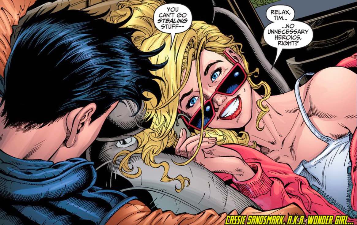 Tim Drake believes Cassie’s powers originated from the theft of an archaeological artifact. As her discontent and past behaviors resurface, Drake is left more cautious and concerned than ever about his teammate. Making this more difficult is romantic tension between the two, Tim and Cassie, which is mentioned in the issue by Miguel (Bunker).